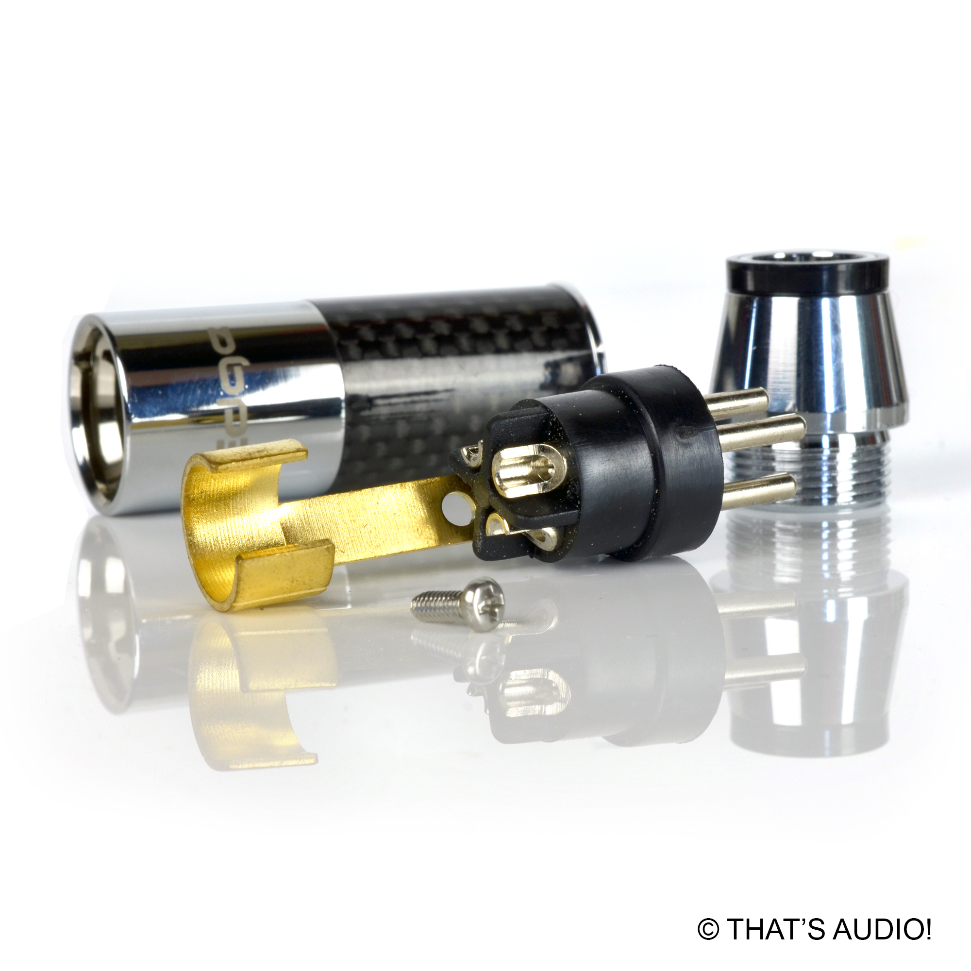 EDGE Premium XLR (Female) connectors. Suitable for terminating quality XLR cable, to create your own custom made balanced interconnects. This stylish XLR plug consists of a black carbon fibre outer shell for durability and a sharp modern design. Cable is fastened in place via large solder buckets, with a crimping collar to fasten the cable in place. Uses the “LATCH-LOCK” system to prvent accidental disconnection. Rhodium plating and sprung construction creates a precise contact for improved signal transfer across audio frequencies. Specifically engineered for Hi-Fi and semi professional amplifiers, music instruments and microphones.