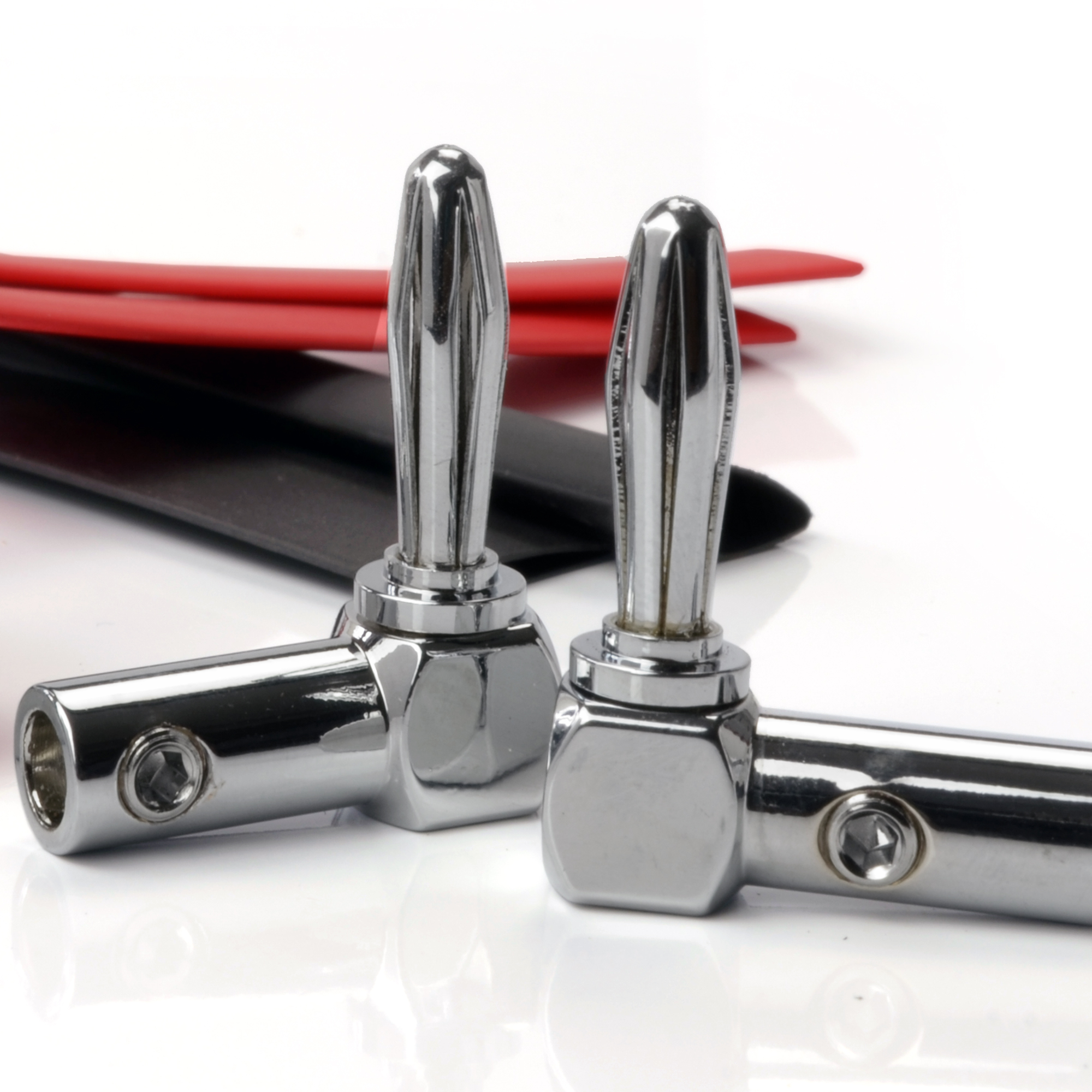 4mm Banana Plug Connectors (male) – EDGE chrome plated banana plug, provides a convenient and reliable way to connect your speaker cables via 4mm binding posts to the amplifier / speaker. The barrel contains two grub screws designed to connect your audio wire for a secure connection without the need for soldering. The sprung section of the plug creates an excellent and secure connection to the binding posts / sockets that are mounted on the speaker or amplifier.