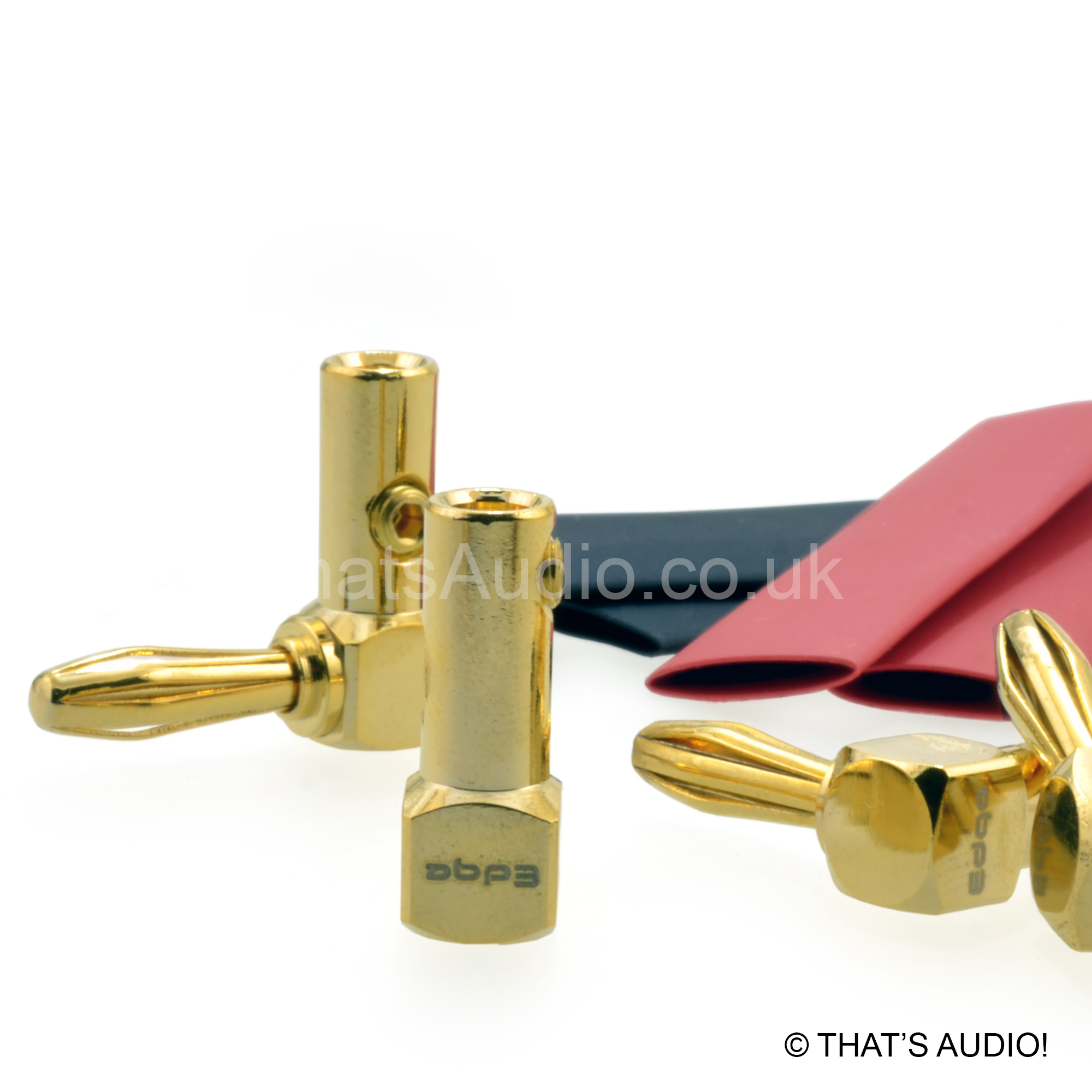 4mm Banana Plug Connectors (male) – EDGE GOLD plated banana plug, provides a convenient and reliable way to connect your speaker cables via 4mm binding posts to the amplifier / speaker. The barrel contains two grub screws designed to connect your audio wire for a secure connection without the need for soldering. The sprung section of the plug creates an excellent and secure connection to the binding posts / sockets that are mounted on the speaker or amplifier.